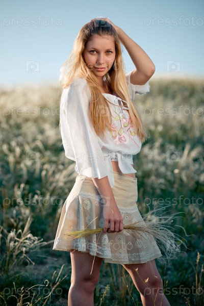 Молодая девушка, стоящая в поле в лучах осеннего солнца