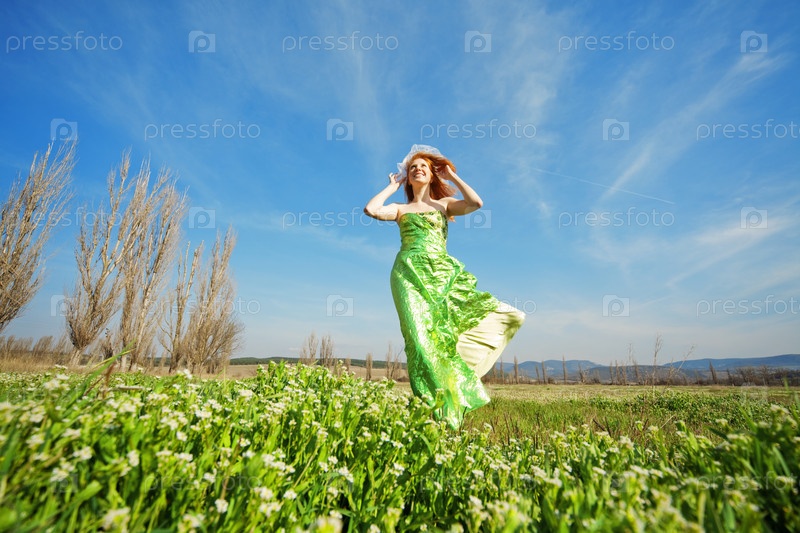 Девушка, одетая в стиле ретро, позирует на лугу