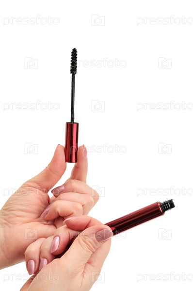 Тушь для ресниц в руке, изолированная на белом фоне