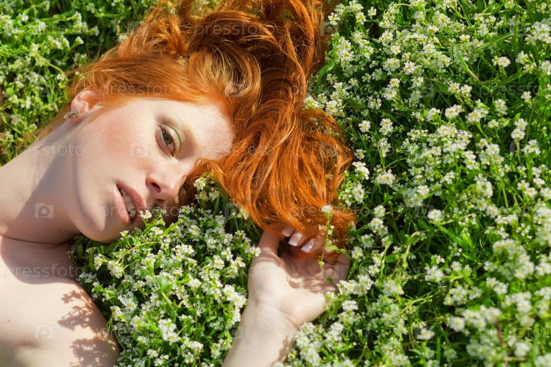 Красивая девушка лежит на зеленой траве