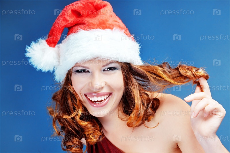 Портрет молодой красивой девушки в шапке Санта-Клауса на синем фоне