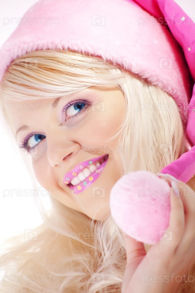 Портрет молодой красивой девушки в шапке Санта-Клауса на белом фоне