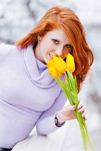Портрет молодой девушки с желтыми тюльпанами