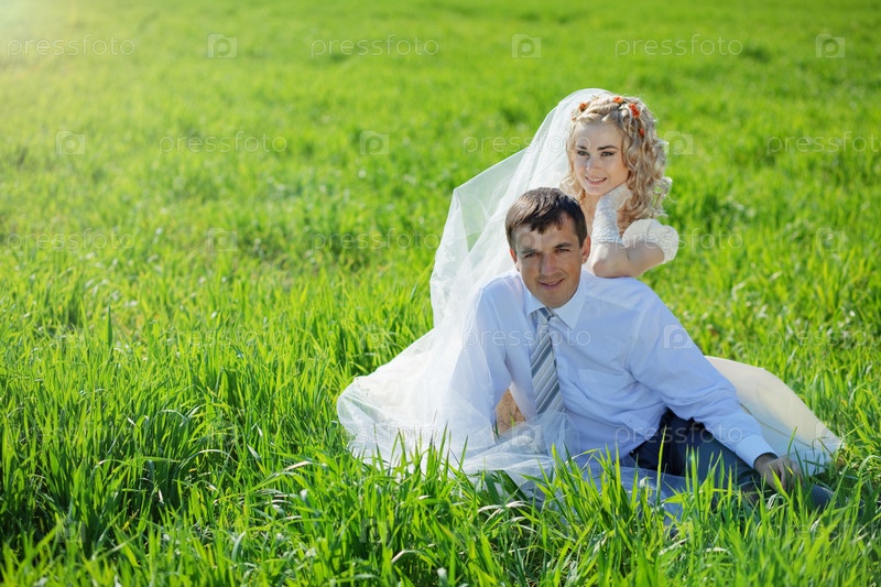 Портрет жениха и невесты, сидящих на зеленой траве