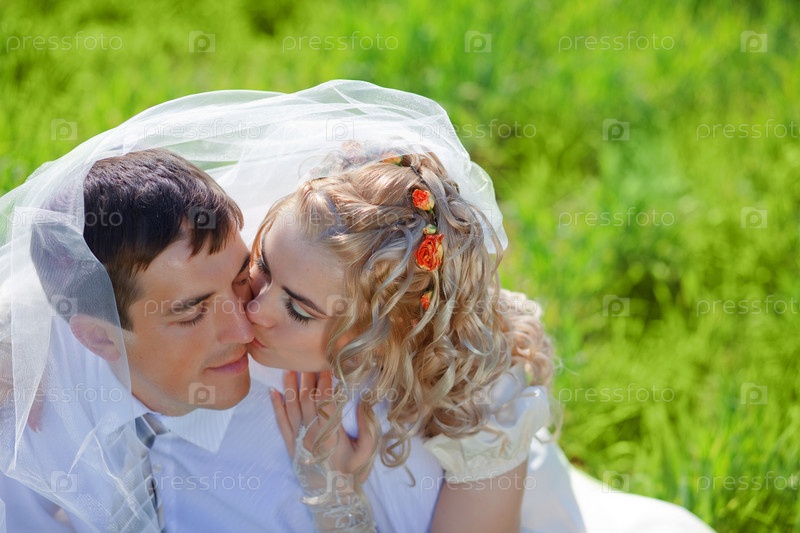 Портрет жениха и невесты, сидящих на зеленой траве
