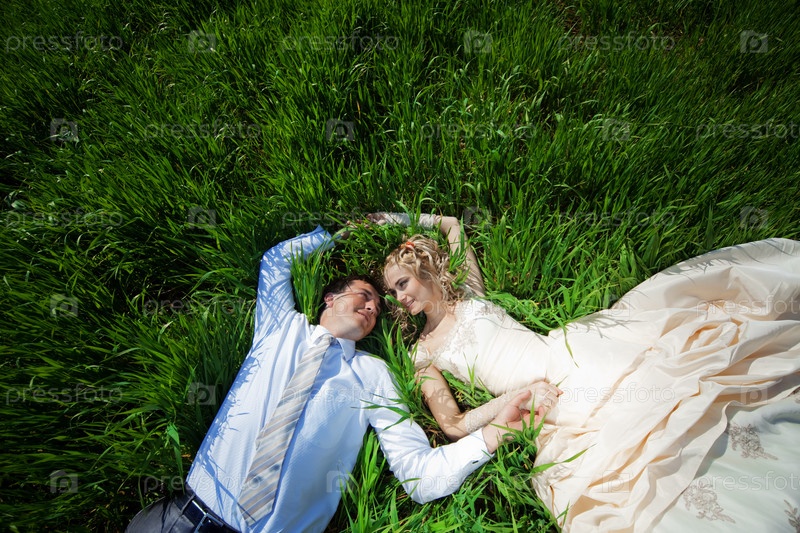 Портрет жениха и невесты, лежащих на зеленой траве
