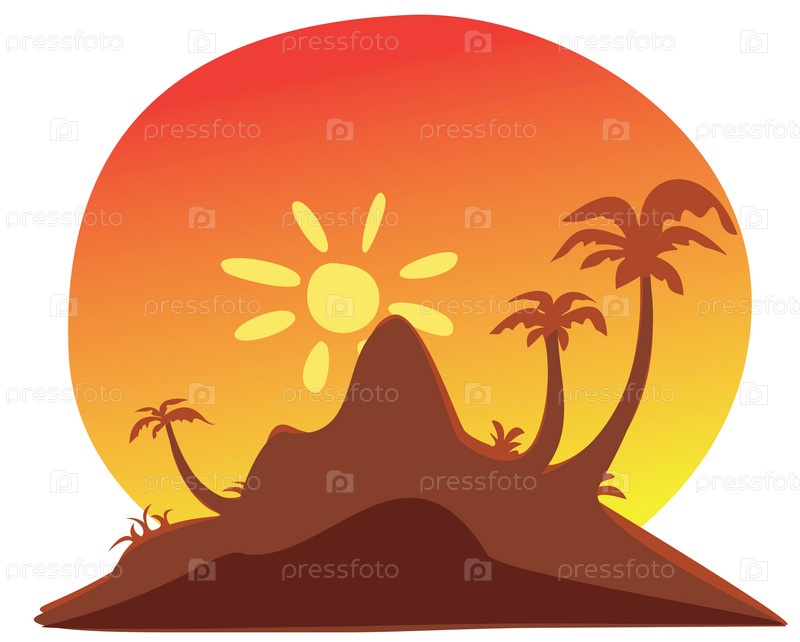 Нарисованный закат на тропическом острове, изолированный на белом фоне