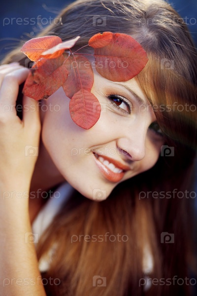 Портрет красивой девушки с красными осенними листьями крупным планом