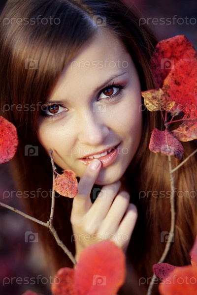 Портрет красивой девушки с красными осенними листьями крупным планом