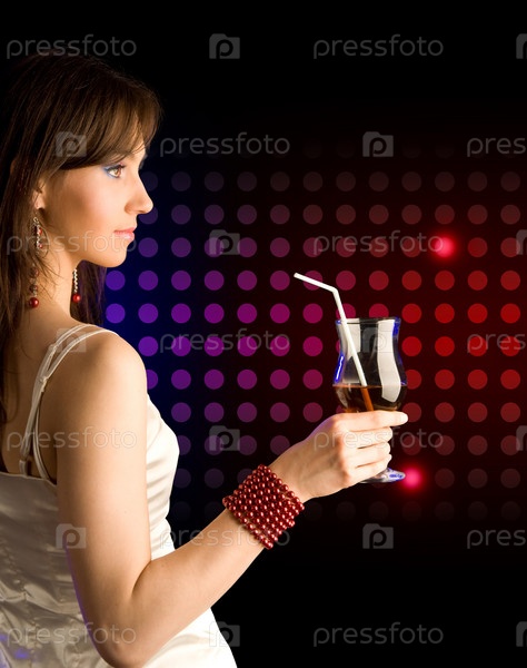 Молодая девушка с коктейлем на цветном фоне