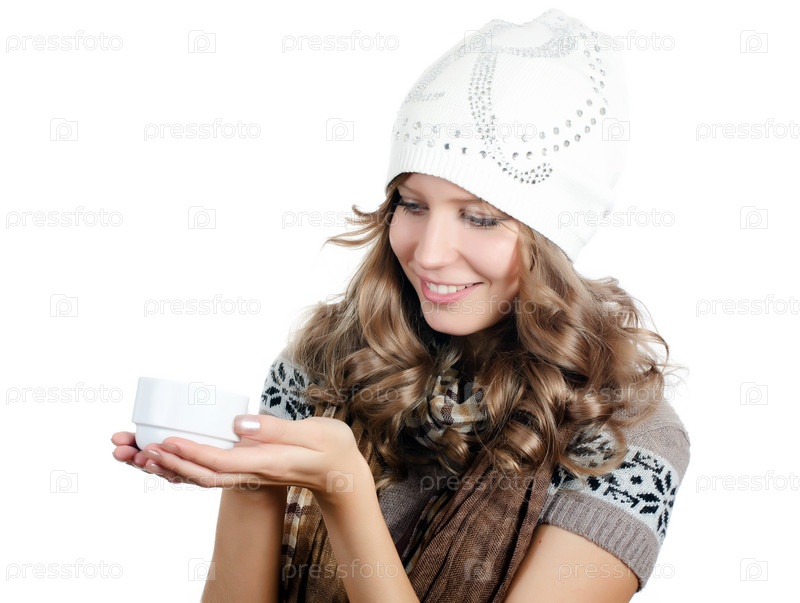 Портрет молодой красивой девушки с чашкой кофе на белом фоне