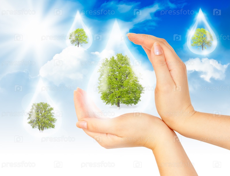 Руки защищают дерево на фоне неба, символ защиты окружающей среды