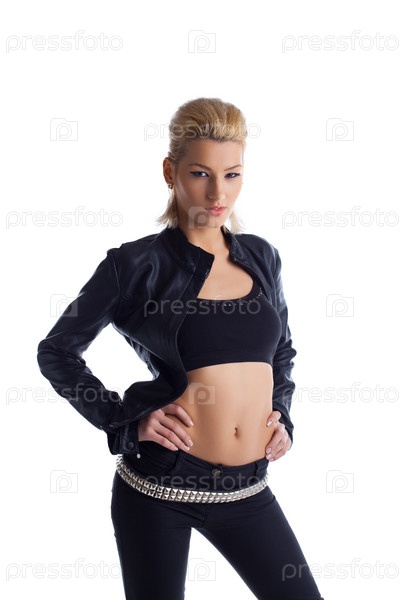 Молодая красивая женщина позирует в кожаной рокерской куртке красном фоне