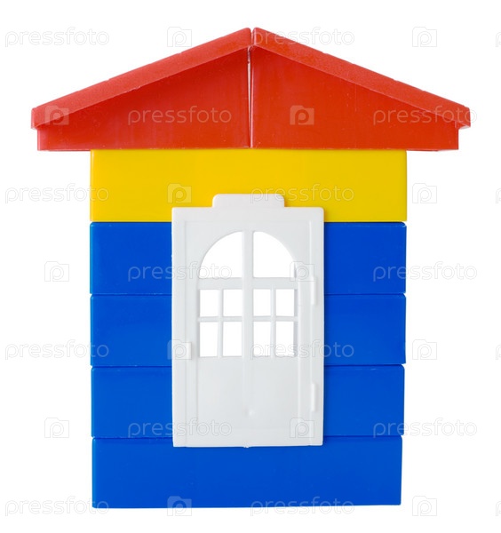 Игрушечный пластиковый цветный дом на белом фоне