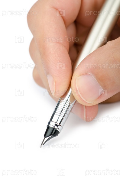 Рука с ручкой на белом фоне крупным планом