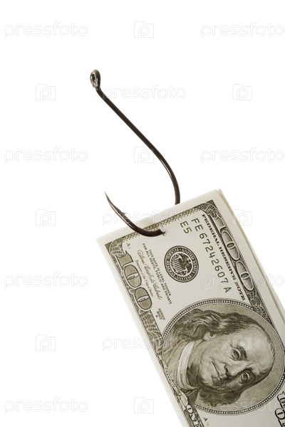 Концептуальное изображение долларовой банкноты, пойманной рыболовным крючком