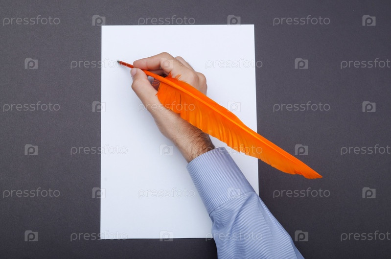 Рука с ручкой в виде пера оранжевого цвета крупным планом