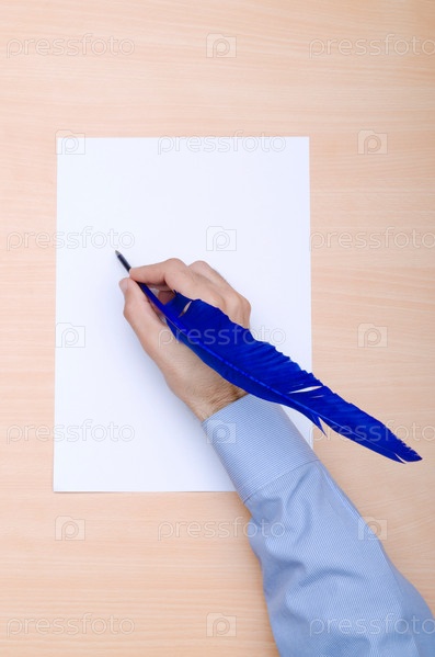 Рука с ручкой в виде пера синего цвета крупным планом