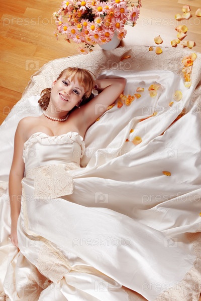 Портрет красивой невесты, лежащей на полу