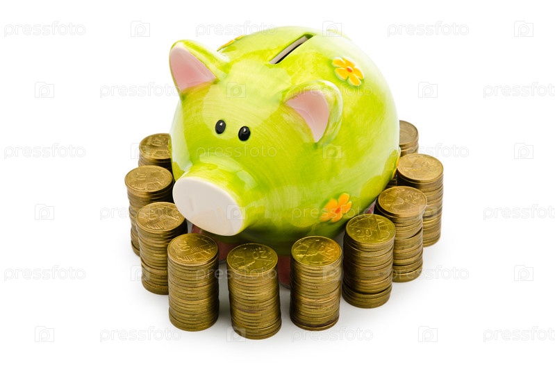 Копилка окруженная монетами на белом фоне