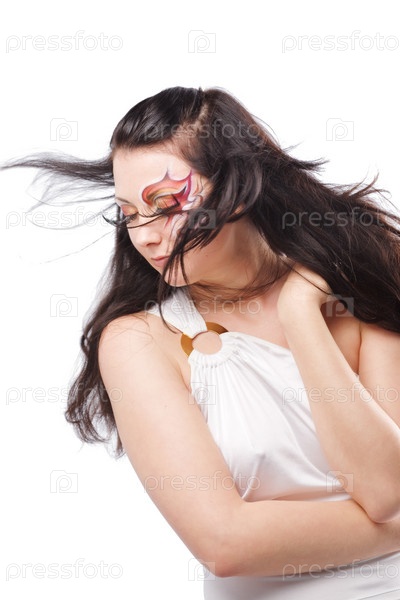 Красивая девушка с очень длинными ресницами и декоративным макияжем на белом фоне