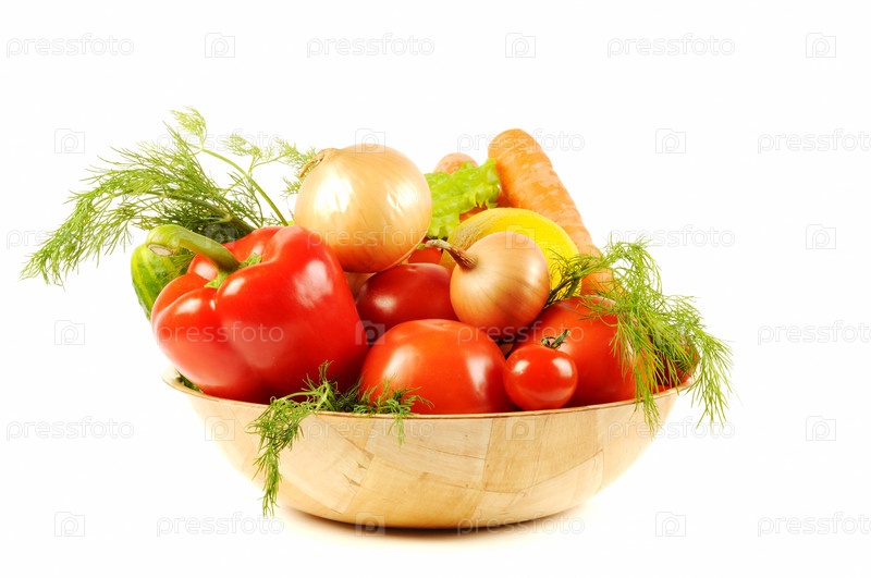 Овощи и зелень в деревянной чаше