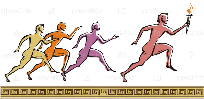 Спортсмены бегут с олимпийским огнем на белом фоне с орнаментом