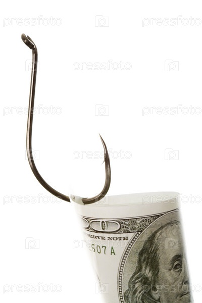 Острый рыболовный крюк с стодолларовой банкнотой на нем