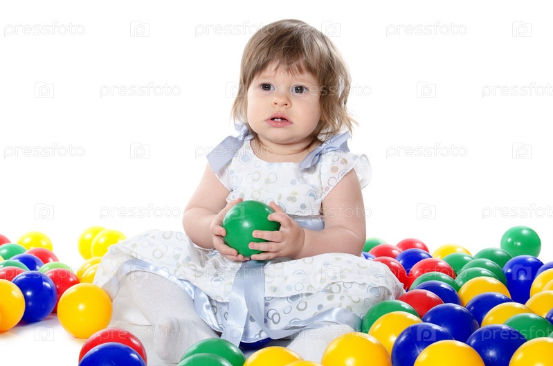 Маленькая девочка, сидящая среди разноцветных мячиков