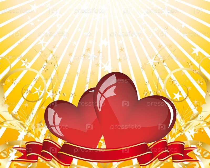 Красные сердца, лента, растительный узор и солнечные лучи, шаблон