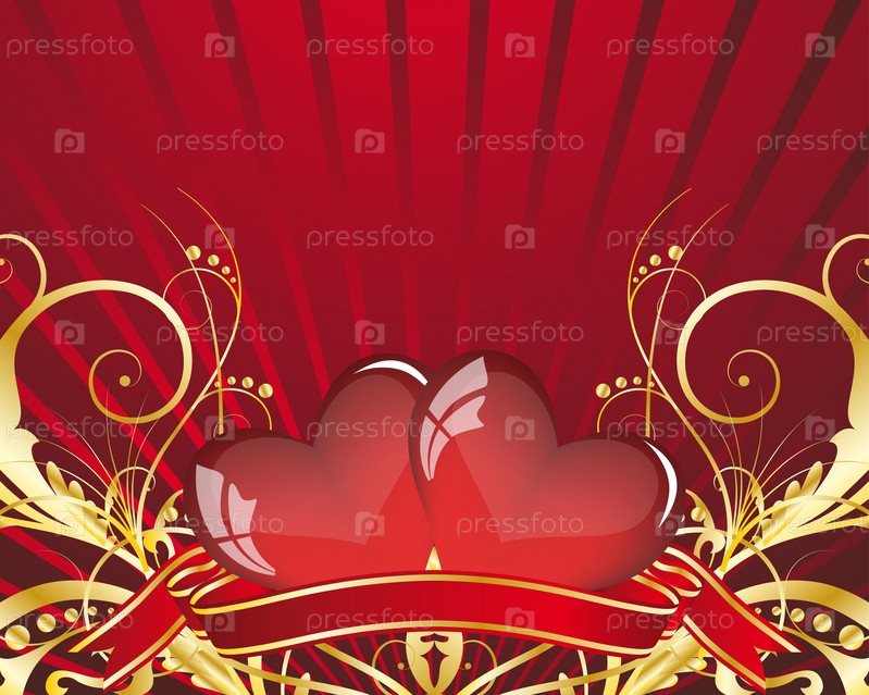 Красные сердца, лента и растительный узор, шаблон