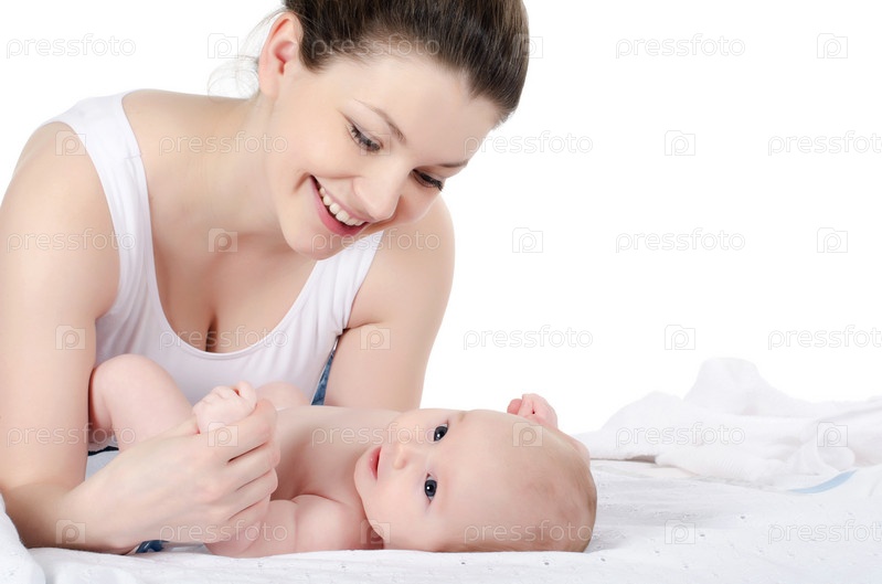 Счастливая мать с ребенком на белом фоне