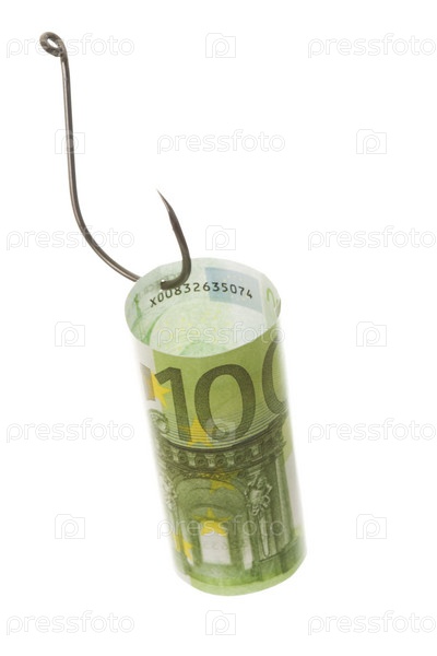 Концептуальное изображение стоевровой банкноты, висящей на рыболовном крюке