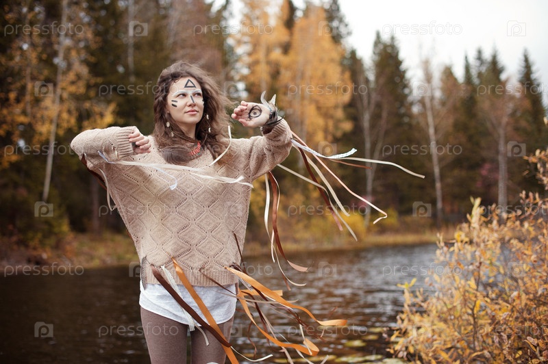 Девушка-шаман у осеннего озера