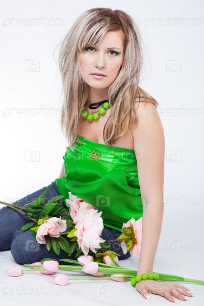 Красивая девушка с ярким макияжем позирует сидя