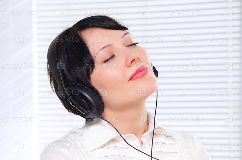 Довольная бизнес-леди в наушниках в офисе