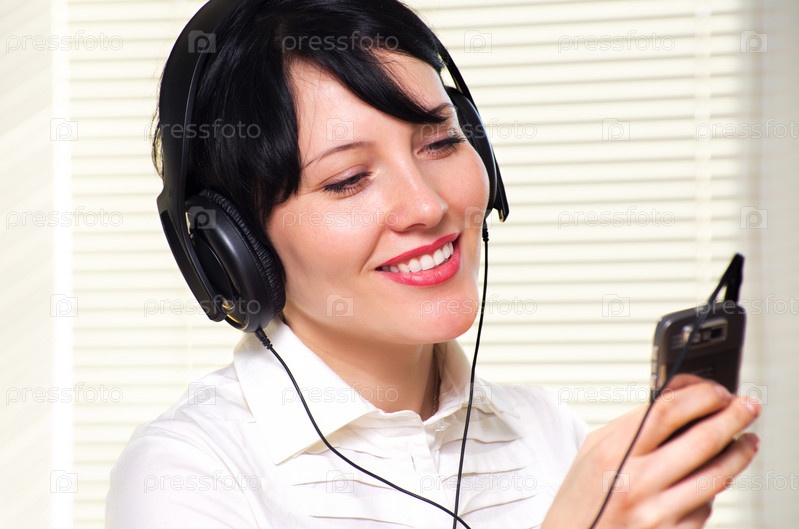 Довольная бизнес-леди в наушниках в офисе