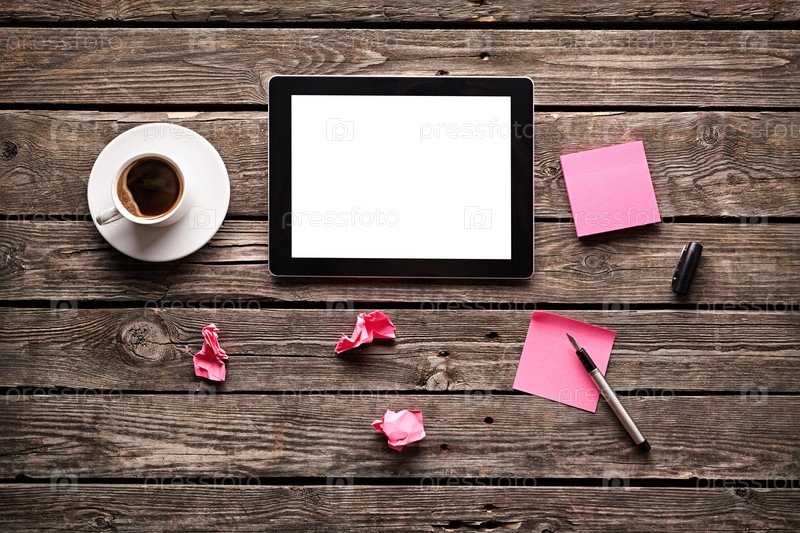 Чашечка кофе, планшет и бумага для заметок