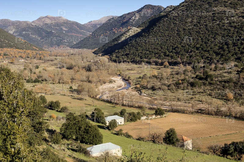 Вид на сельскую местность, горы и реку