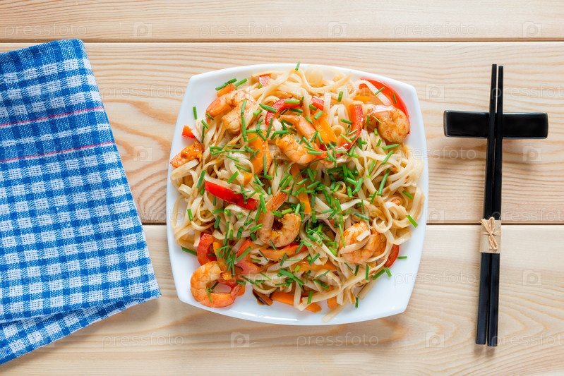 Вкусная паста с креветками и овощами