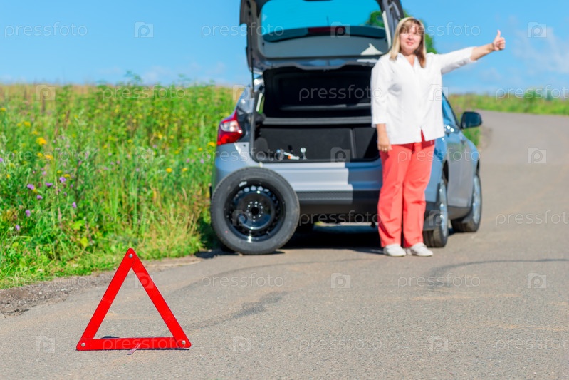 Женщина около машины со спущенным колесом