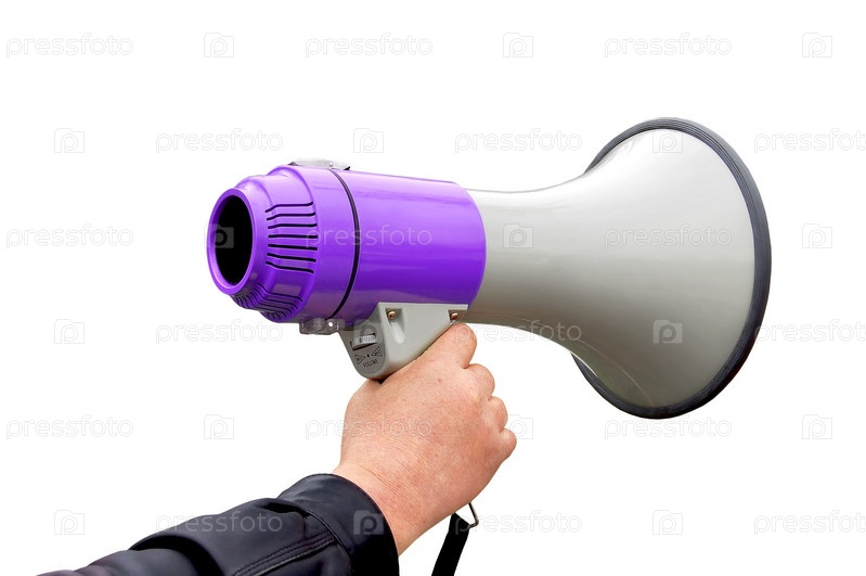 Мегафон в руке мужчины на белом фоне