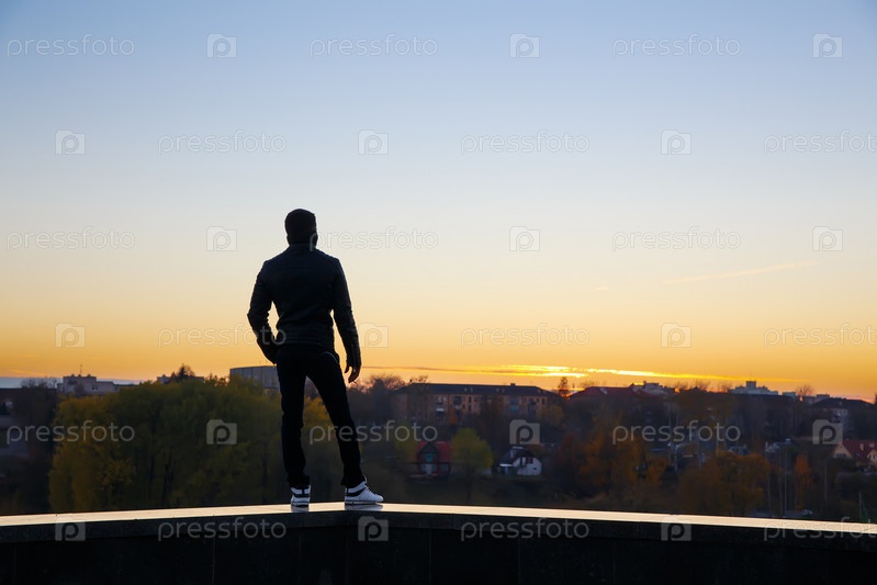 Мужчина встречает закат, стоя на крыше