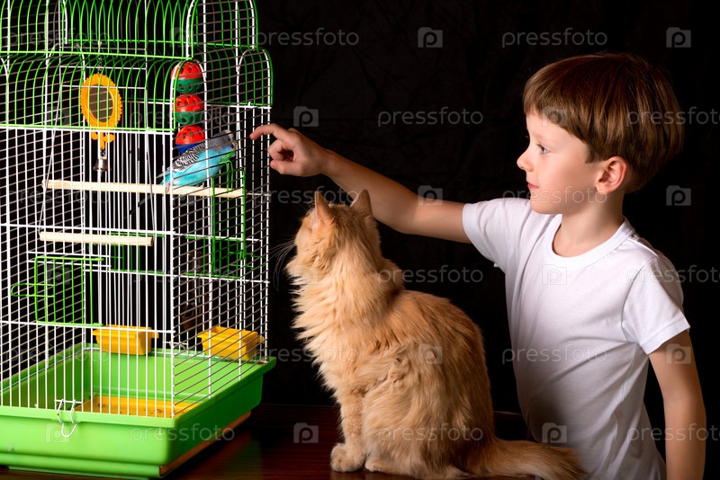 Мальчик и кошка наблюдают за попугаем в клетке
