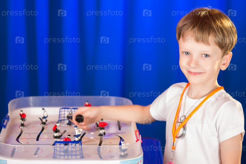 Мальчик, играя настольный хоккей