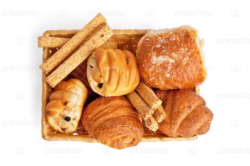 Булочки с изюмом, хлебные палочки, круассан, слоеная булочка с посыпкой в плетеной корзинке на белом фоне