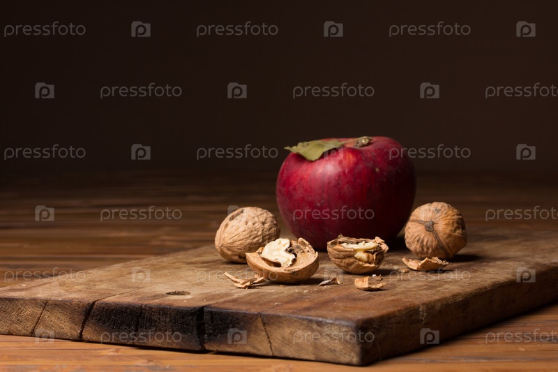Спелые грецкие орехи и яблоко