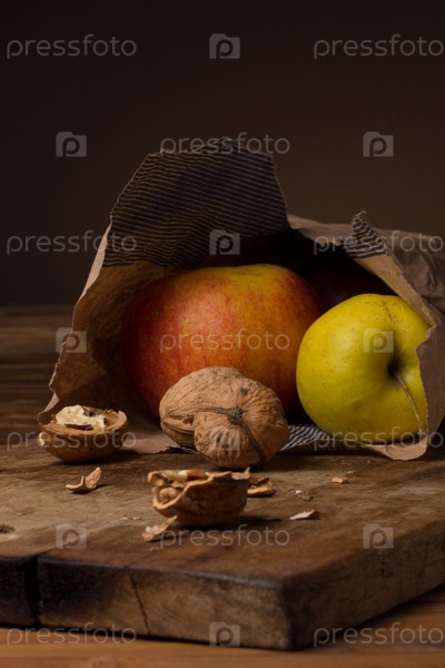 Спелые грецкие орехи и яблоки