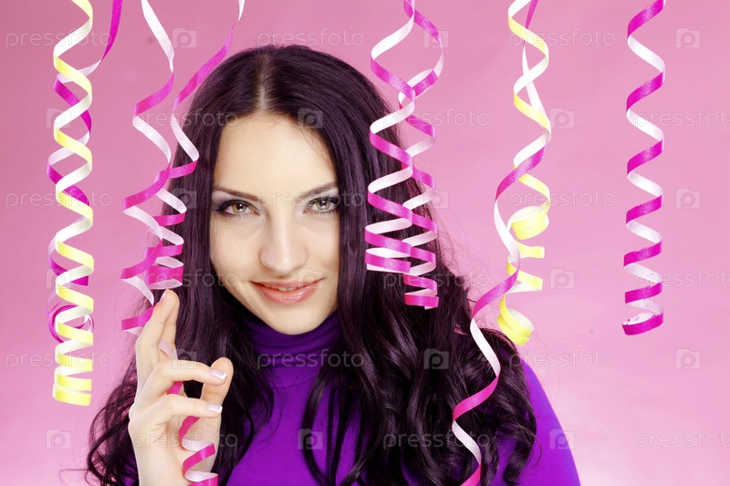 Портрет красивой женщины с праздничными ленточками на розовом фоне