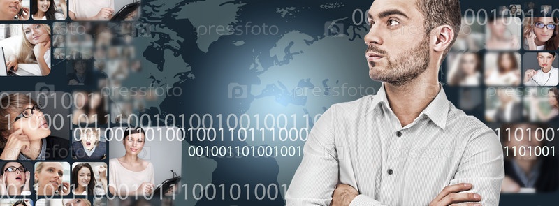 Портрет молодого предпринимателя на фоне карты мира и изображений различных людей